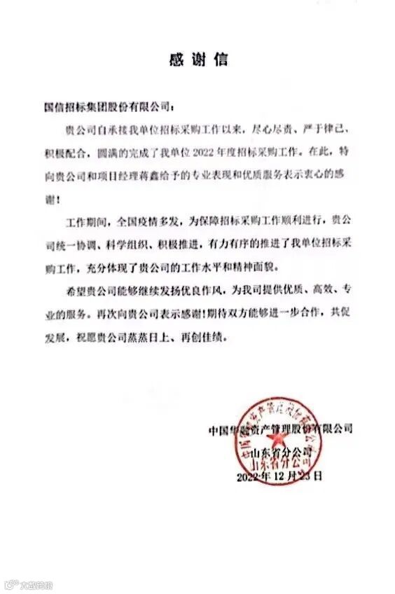 这其中,还有来自中国华融资产管理股份有限公司山东分公司的感谢信,感谢国际招标集团股份有限公司在承担项目单位招标采购工作以来,尽心尽责、严于律己、积极配合,圆满完成项目单位2022年度招标采购工作。尤其在疫情期间,公司统一协调、科学组织、积极推进,有力有序地保障了项目单位招标采购工作的顺利进行,对集团提供的优质、高效、专业的服务表示感谢。