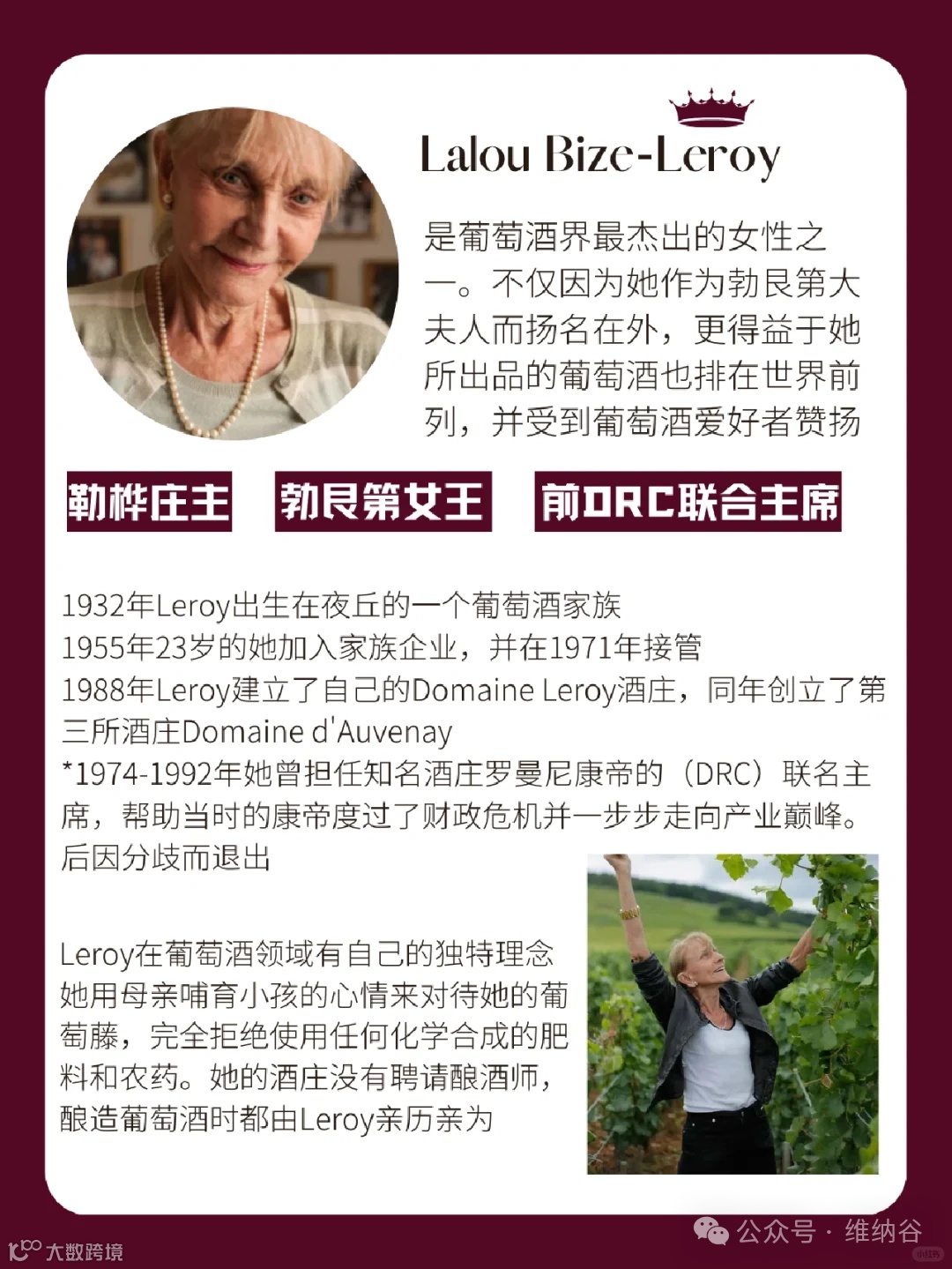 有人说她是勃艮第的“铁娘子”,有人称她为勃艮第“女王”。提到她,难免会想到她与DRC的“爱恨情仇”,她23岁进入家族企业Maison Leroy, 1974担任DRC的经理人,同Aubert de Villain共同执掌这座世界上最贵的酒庄18年,将DRC经营的蒸蒸日上,后来由于一系列意见分歧分道扬镳。1988年建立了自己的Domaine Leroy酒庄,以自己的独特理念打造酒业帝国。Domaine Leroy已成为令许多酒庄望其项背的顶级勃艮第酒庄,虏获各大葡萄酒评论家的爱酒之心,好评如潮。顺带一提,周董也是Leroy的粉丝哦~