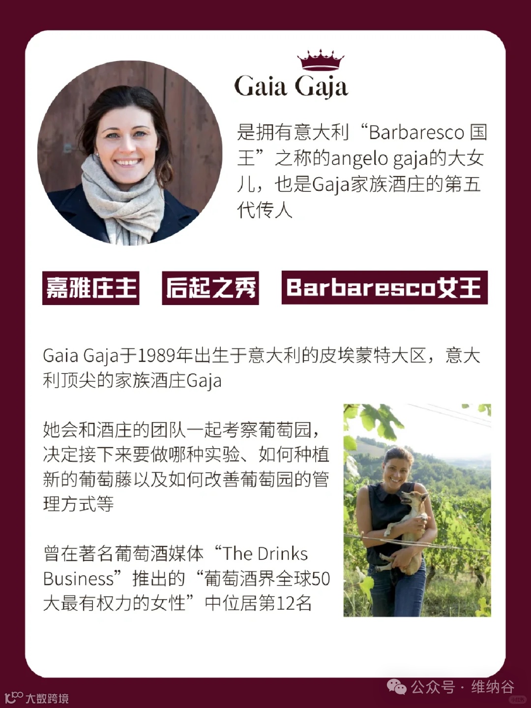 于1989年出生于意大利的皮埃蒙特大区,意大利顶尖的家族酒庄Gaja,是酒庄的第五代掌门人。继承了Gaja家族一惯的野心及顽强特质、沉稳自信的气质,在2012年底著名葡萄酒媒体“TheDrinksBusiness”推出的“葡萄酒界全球50大最有权力的女性”中位居第12名,同AlbieraAntinori一起被认为是意大利最有实力的女性后起之秀~