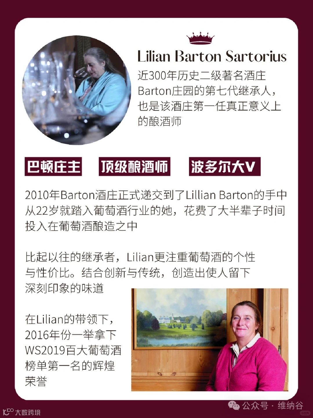 近300年历史二级著名酒庄Barton庄园的第七代继承人,也是该酒庄第一任真正意义上的酿酒师。2010年酒庄正式递交到了LillianBarton的手中。从22岁就踏入葡萄酒行业的她,花费了大半辈子时间投入在葡萄酒酿造之中。比起以往的继承者,Lilian更注重葡萄酒的个性与性价比。结合创新与传统,创造出使人留下深刻印象的味道。Barton在Lilian的带领下,2016年份一举拿下WS2019百大葡萄酒榜单第一名的辉煌荣誉!