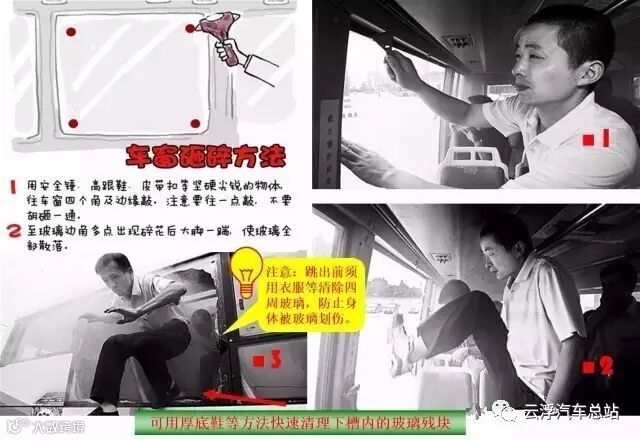 如果在乘坐车辆的过程中发现火灾或者闻到浓浓的烟味(汽油味),应当立即通知司机停车,然后采取以下三种途径逃生: