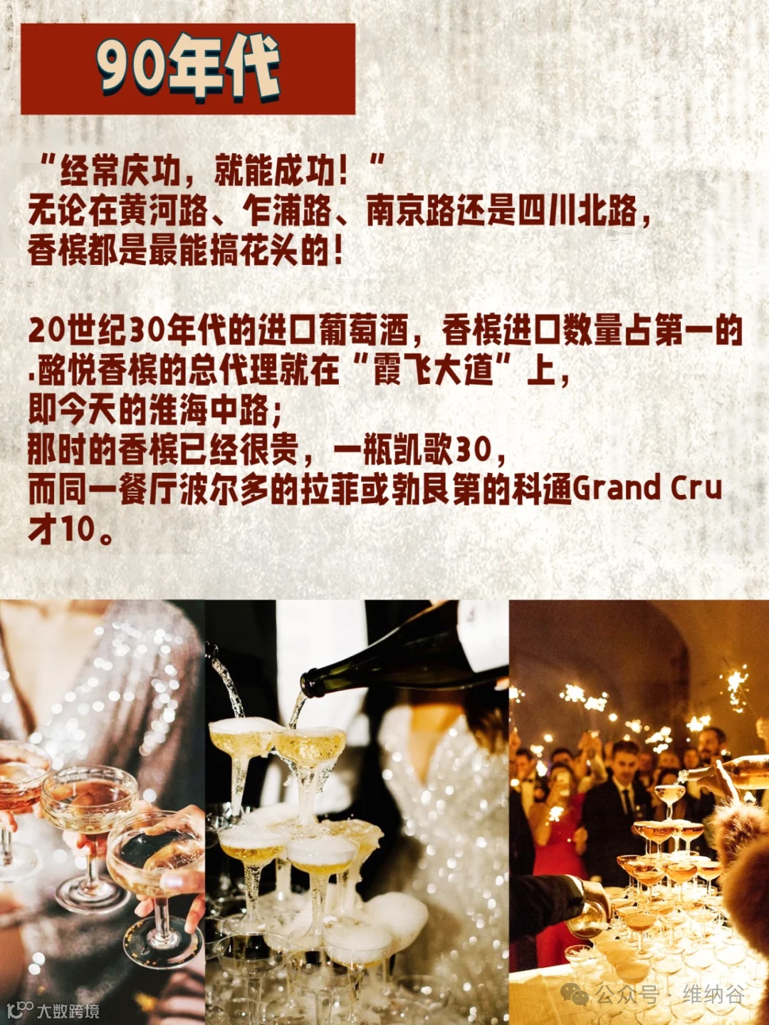 20世纪30年代的进口葡萄酒,香槟进口数量占大头的。酩悦香槟的总代理就在“霞飞大道”上,即今天的淮海中路;那时的香槟已经很贵,一瓶凯歌30刀,而同一餐厅波尔多的拉菲或勃艮第的科通Grand Cru才10刀。《上海日报》主编提过,在上海的富豪宅邸很流行里喝香槟。市内众多的餐馆、酒吧、俱乐部和舞厅也提供香槟。