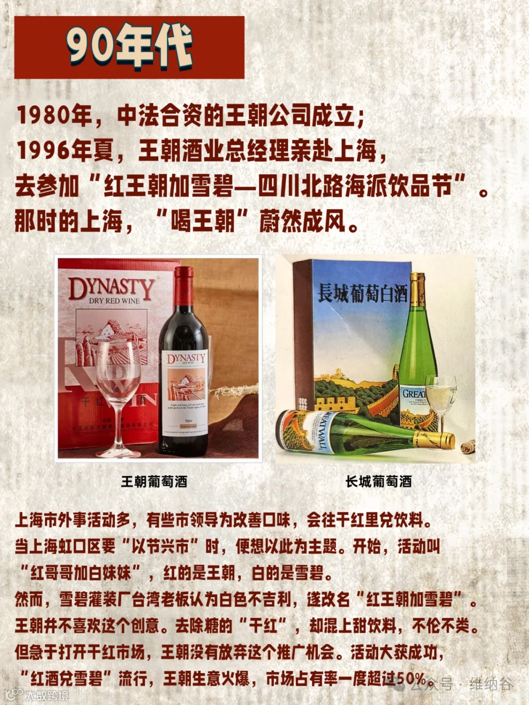 1996年夏,王朝酒业总经理亲赴上海,去参加“红王朝加雪碧节”。上海市外事活动多,有些领导喜欢往干红里兑雪碧。王朝急于打开干红市场,就使用了这种推广方式,“红酒兑雪碧”大流行,王朝生意火爆,市场占有率一度超过50%。(所以小时候喝红酒兑雪碧不是我们的错啊啊啊啊