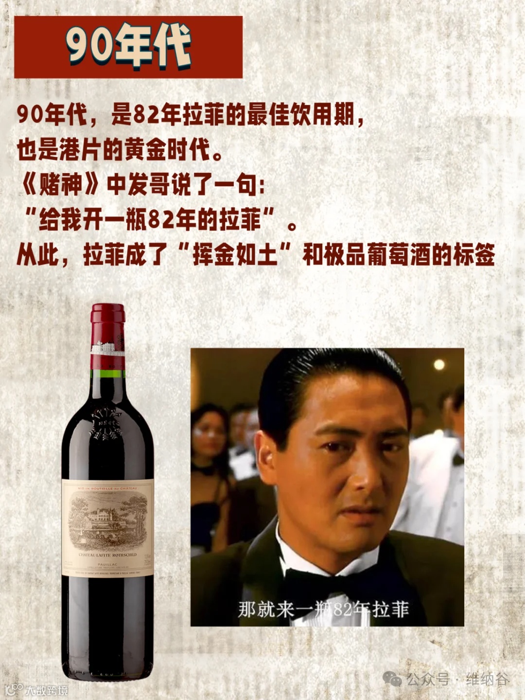 90年代港片的黄金时代,是82年拉菲的饮用期。《赌神》发哥台词:“给我开一瓶82年的拉菲”。从此,拉菲成了“挥金如土”和顶级葡萄酒的代名词。