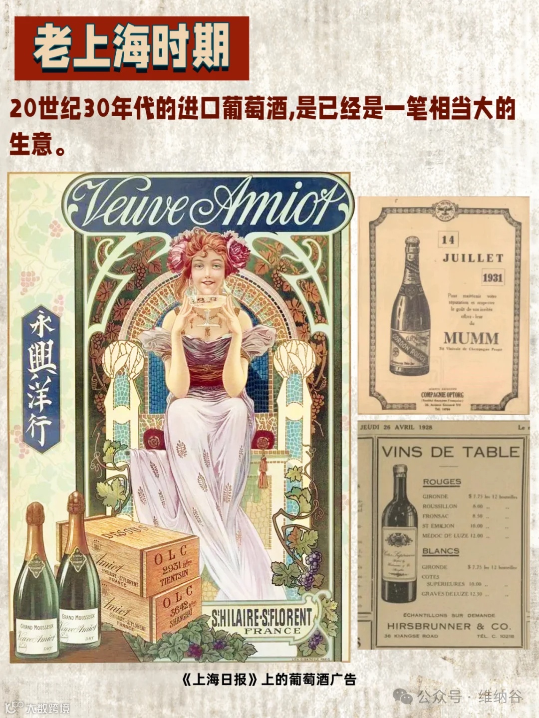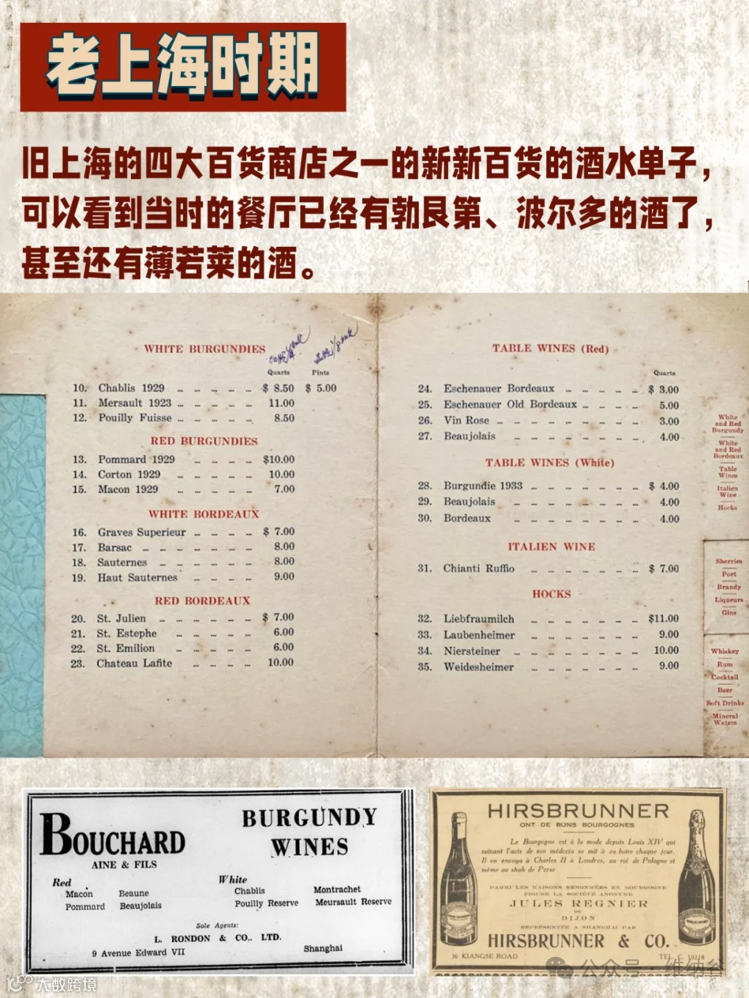 20世纪30年代的进口葡萄酒进口是已经是一笔相当大的生意。旧上海的四大百货商店之一的新新百货的酒水单子,可以看到当时的餐厅已经有勃艮第、波尔多的酒了,甚至还有薄若莱的酒。