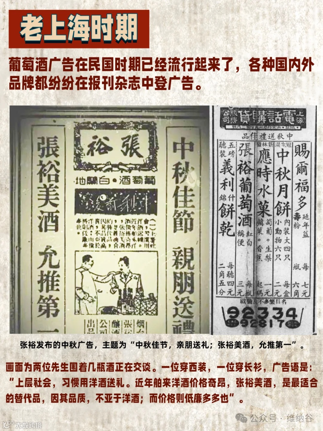 民国时期,葡萄酒广告已经流行起来了,各种国内外品牌在中国报刊登广告。张裕在民国时期《申报》发布的中秋广告,主题为“中秋佳节,亲朋送礼;张裕美酒,允推第一”。