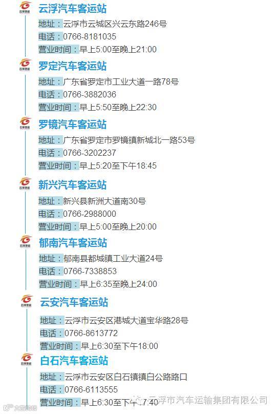 (云浮市汽车运输集团有限公司下属车站包括:云浮汽车总站、罗定汽车总站、罗镜汽车客运站、新兴汽车客运站、郁南汽车客运站、云安汽车客运站、白石汽车客运站)