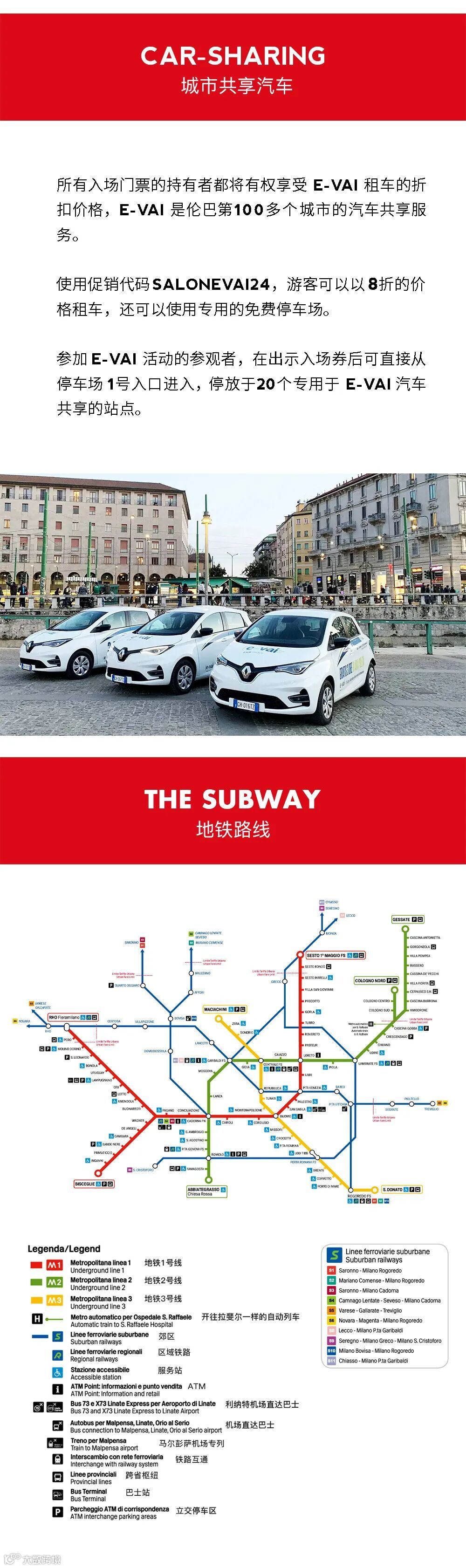 以下为米兰出行攻略,2024年的展览交通特别策划了城市共享汽车,持有门票的朋友们可以享受专属折扣,享受免费停车服务,展馆停车场还设有专用停车位,方便出行(详询官方媒体...)另附米兰城市地铁交通图。