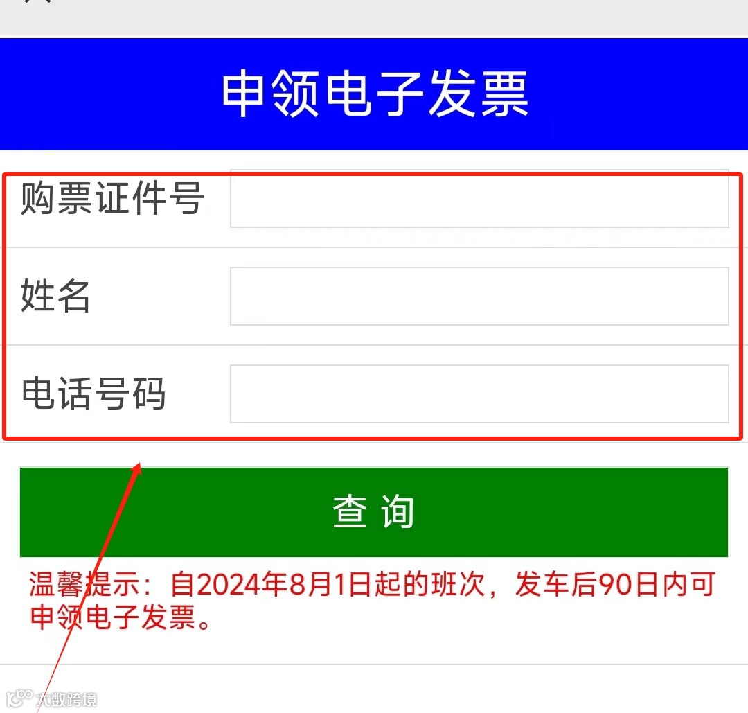 3.在申领电子发票界面填写购票证件号、姓名、电话号码→点击“查询”→填写开票内容(个人/单位);