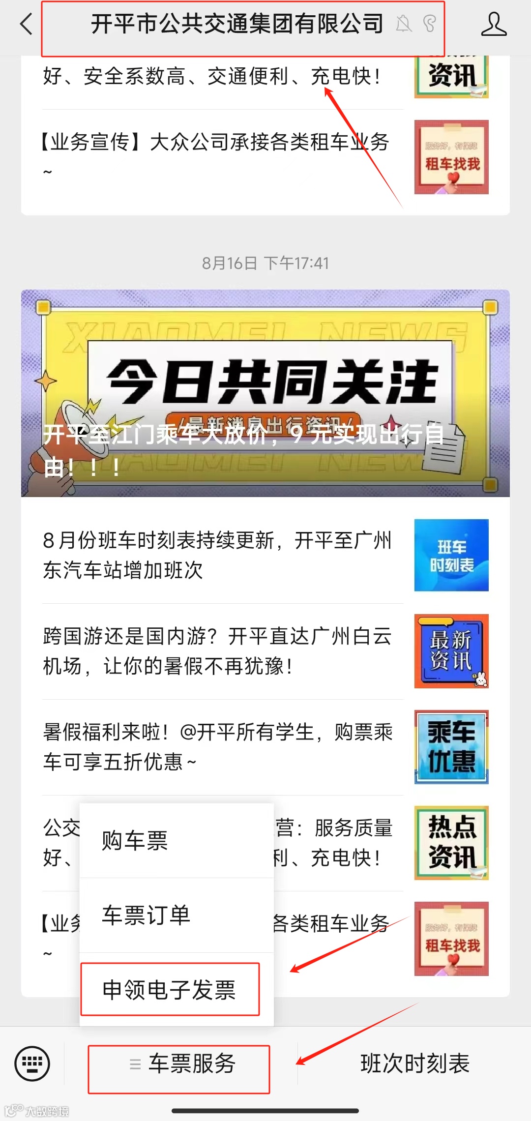 1.关注“开平市公共交通集团有限公司”微信公众号;