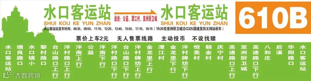 首末站为水口客运站至水口客运站,往公益站、水口潭江村、亚洲厨卫城方向单向运行。