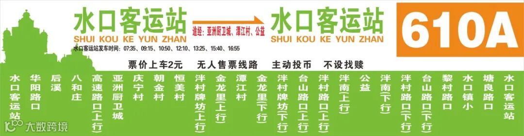 首末站由“公益至亚洲厨卫城”调整为610A路“水口客运站至水口客运站”,往亚洲厨卫城、水口潭江村、公益站方向单向运行。