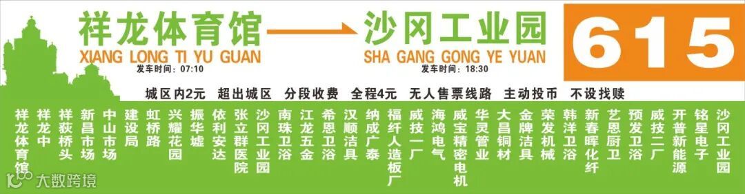 保持615路“祥龙体育馆至沙冈工业园”途经站点不变;取消615路“沙冈工业园至水口潭江村”途经站点。具体如下: