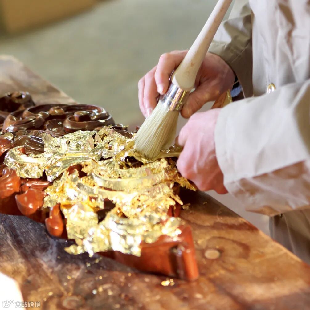 手工搽金箔&描金是意大利古老的传承匠艺,如同纯手雕刻、缝制一样,需要几十年的潜心修为才能有一番造诣。所谓金箔,顾名思义是以黄金锤薄而成,一克黄金可以打制成约0.5平方米的纯金箔,厚度为0.12μm。
