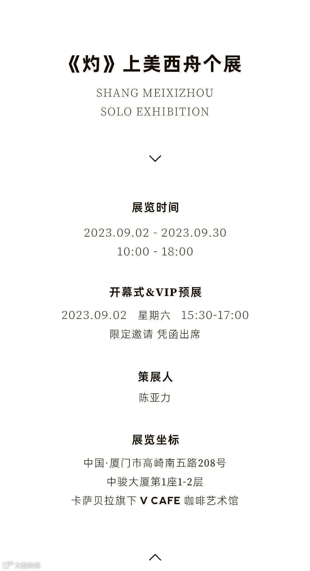 导读:以“灼”之名,擅闯上美西舟的精神领地 —— 卡萨贝拉全新美学空间V CAFE咖啡艺术馆9月新展即将开幕,敬请持续关注!