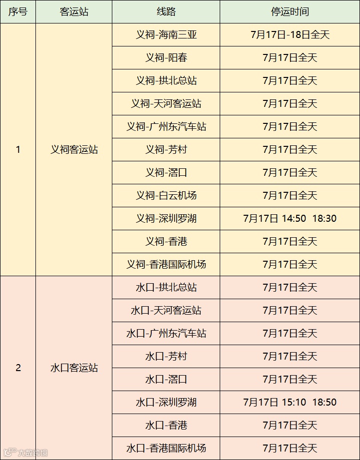 7月17日-7月18日,义祠客运站、水口客运站所有班车暂停线上售票(含自助购票机),如需购票,可前往上述两站售票窗口购票。