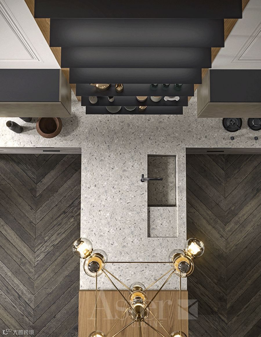 灰纹大理石、橡木、榆木、混凝土等天然材质与不锈钢、玻璃、陶瓷的搭配出来的线性结构和每一处收纳空间的合理利用,在讲究精简和细节的基础上,更突出了每个独立单元与生活之间的收放自如。