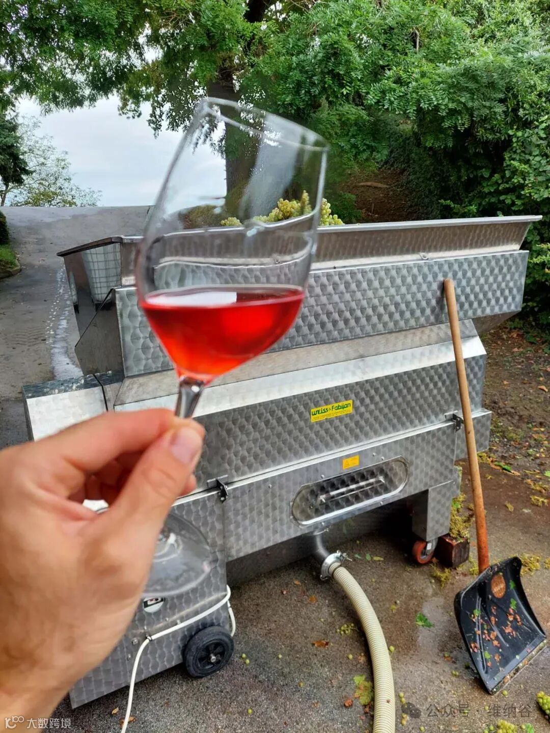 1、将葡萄去梗、破皮,或将整串葡萄带梗破皮,这是白葡萄酒酿造的第一步。