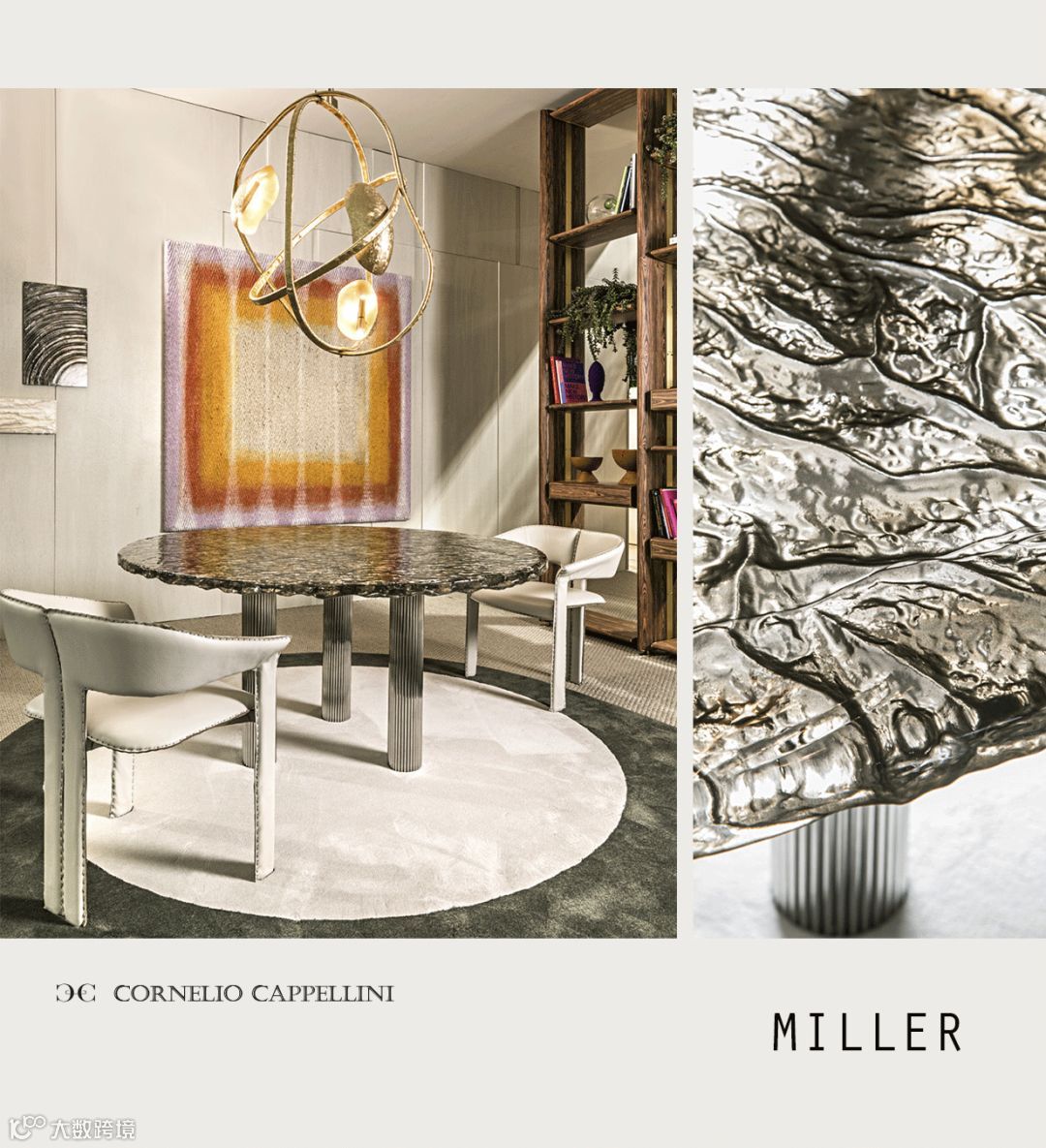 # Miller 餐桌:Murano Glass 再一次扮演了这次的主角,极具当代艺术风格的造型,在威尼斯工匠数百次的尝试下才得以落笔杀青。手工的生产意味着每一件餐桌都有独一无二的细节表现,富有装饰性的色彩增强了触觉与视觉的感官结合。
