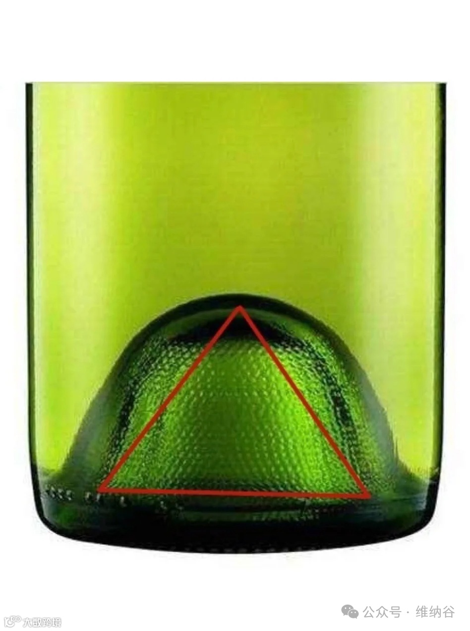 酒瓶凹槽的存在使瓶子底部形成了三角形,三角形具有稳定性,可以使瓶身稳固直立,起到防摔的效果。