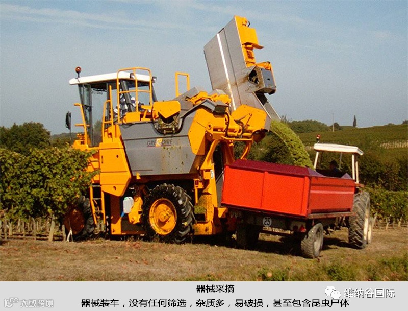 采集过程中容易造成葡萄破损,也会把很多杂质一并采集,因此会多出一些异物风味,而且机器采收是很难了解葡萄的成熟时间的,众所周知,优质葡萄酒需要葡萄成熟程度高度一致的。
