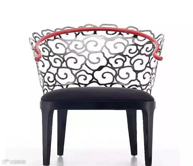 对于中国文化有着深厚的理解,并致力于将古老的文化图腾转化为现代设计语汇的邱德光在着手设计云椅之际,便将云纹所代表的哲学意涵、思想文化纳入肌理,接着再透过3D雷射雕刻技术和老师傅的传统手工艺勾勒出云纹活泼灵动的线条,展现出钢材如行云流水般的意境;而珠红的椅圈则象征盘据云顶的龙正待时而起。