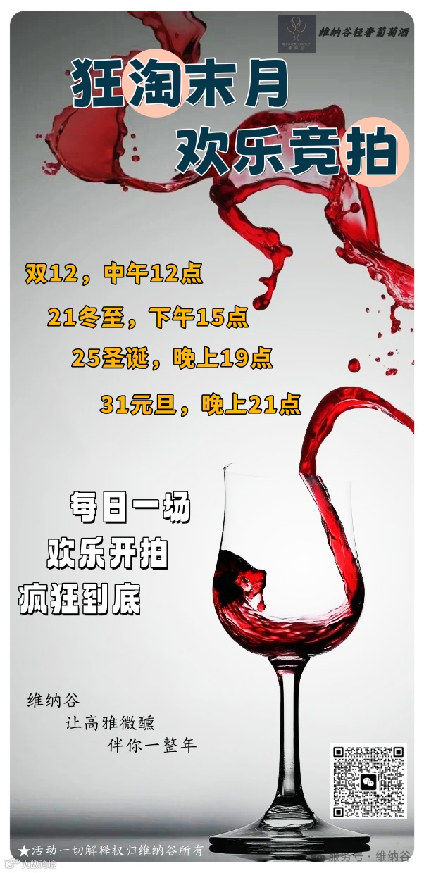 维纳谷轻奢葡萄酒诚挚邀请您参加我们的特别活动——“狂淘末月,欢乐竞拍”。为了庆祝即将到来的年末,我们特别推出2024年12月最后一个月的竞拍活动,让您有机会以超值的价格收藏我们的优质葡萄酒。现在赶快扫码入群来参与我们的竞拍活动,让维纳谷轻奢葡萄酒陪伴您度过这个美好的年末时光。机会难得,千万不要错过哦