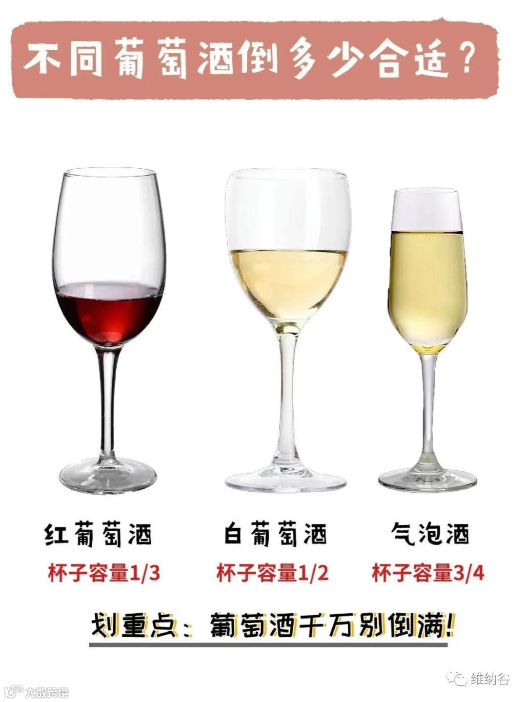 根据不同葡萄酒使用不同杯型的规矩,有经验之士总结了更加简便的倒酒规范可供参考:红葡萄酒入杯为1/3;白葡萄酒入杯为2/3;香槟斟入杯中时,应先斟到1/3,待酒中泡沫消退后,再往杯中续斟至七分满即可。
