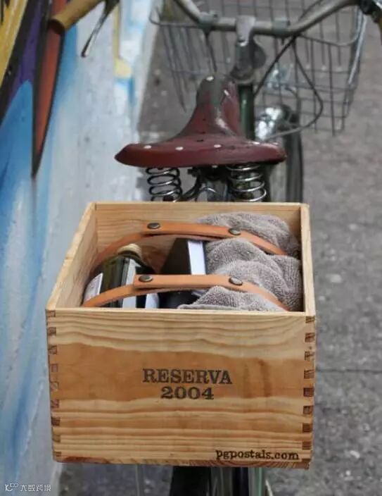 在空木箱中铺上防尘防震的布料,便可固定在自行车的后座上成为车后篮,足够宽敞,足够稳当。春游也好,看海也罢,载着葡萄酒与美食,踩着单车一路畅爽。