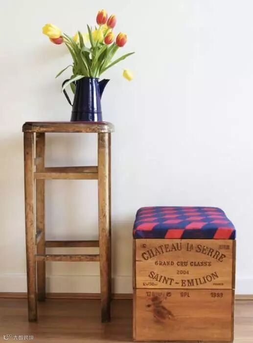 两个空木箱一垒,钉子加固,铺上喜欢的软坐垫,一张颇有古色韵味兼实用性的软木椅就大功告成啦。