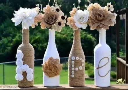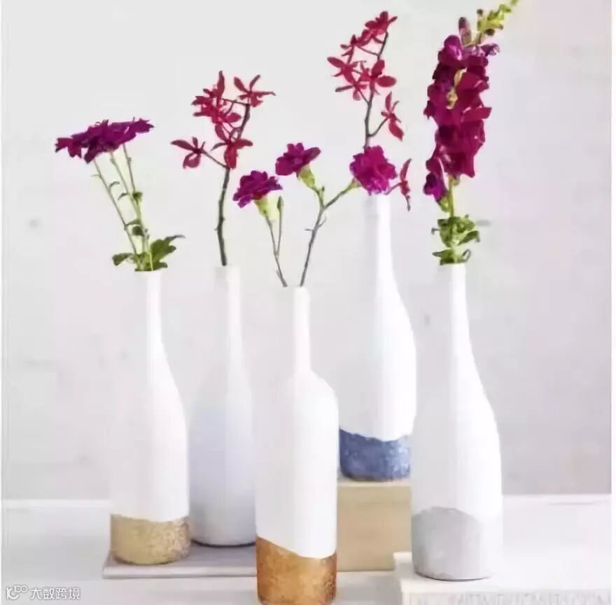 深色的红酒瓶,一般可以利用麻绳、喷漆、布艺,对酒瓶进行再次改装,变成个性化自制的花瓶。发挥创意绝对不比外面买回来的花瓶差哦!