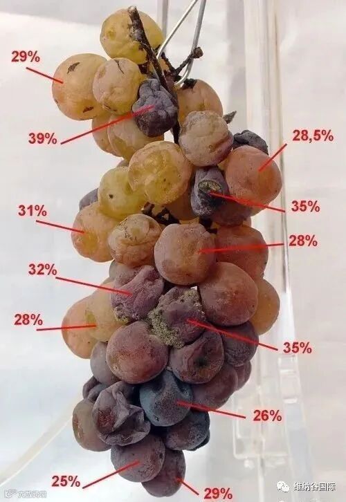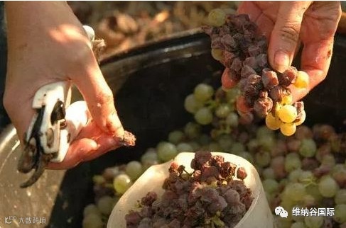 其实,它并不是真的烂了。只是葡萄颗粒因受到一种叫做Botrytis Cinerea(葡萄孢)的霉菌感染,而被蛀出我们肉眼看不见的小孔,这使得葡萄里的水分被蒸发,逐渐变得干瘪,且表皮上形成一层薄薄的黑灰色茸毛。这种细菌是一种自然界存在的腐性寄生物,经常寄生在水果皮上,对人体无害。这样的感染过程不仅能使原本已经很甜的葡萄果实变得更甜,而且产生了让口感更圆滑滋润的甘油,并形成格外动人饱满的香气。