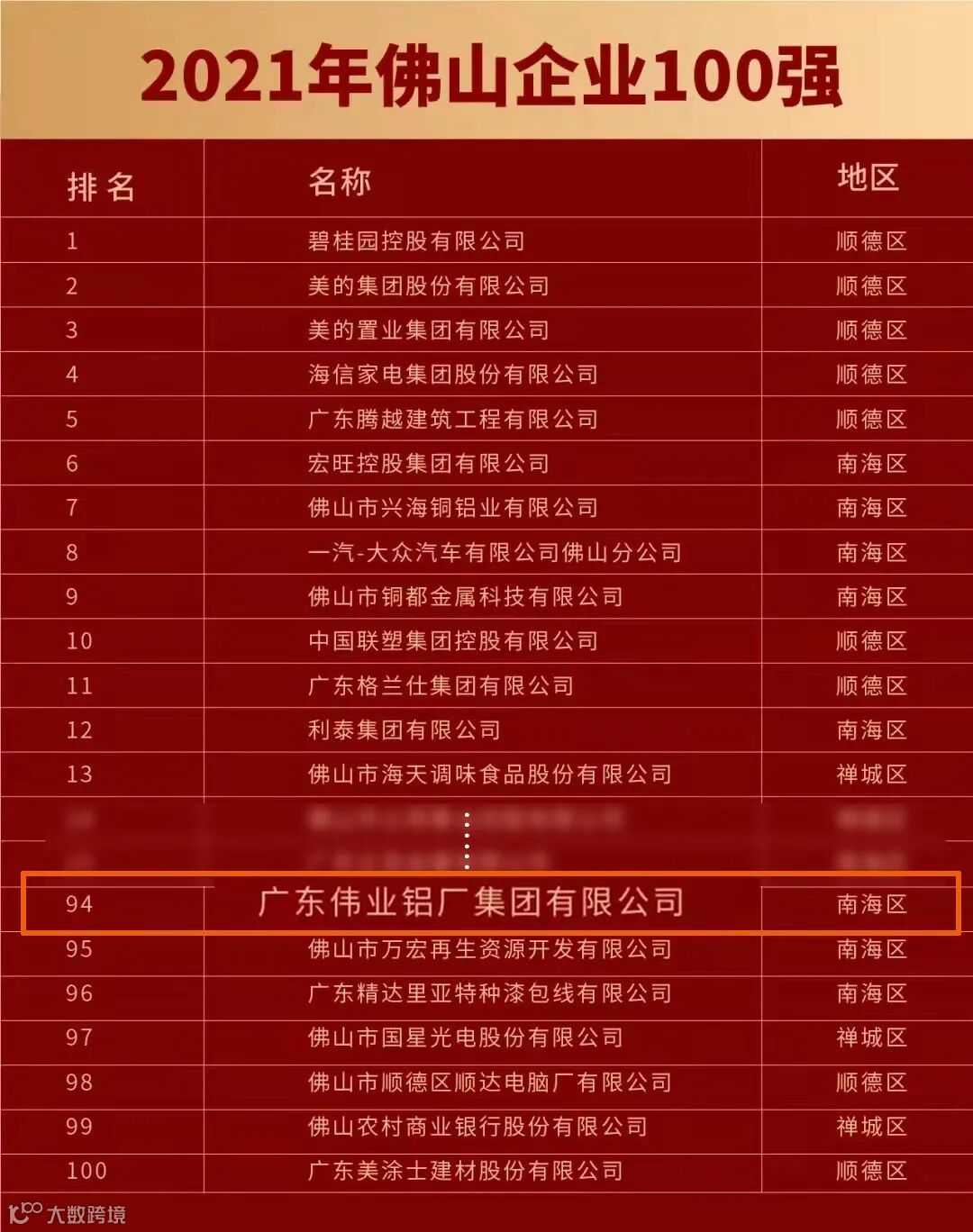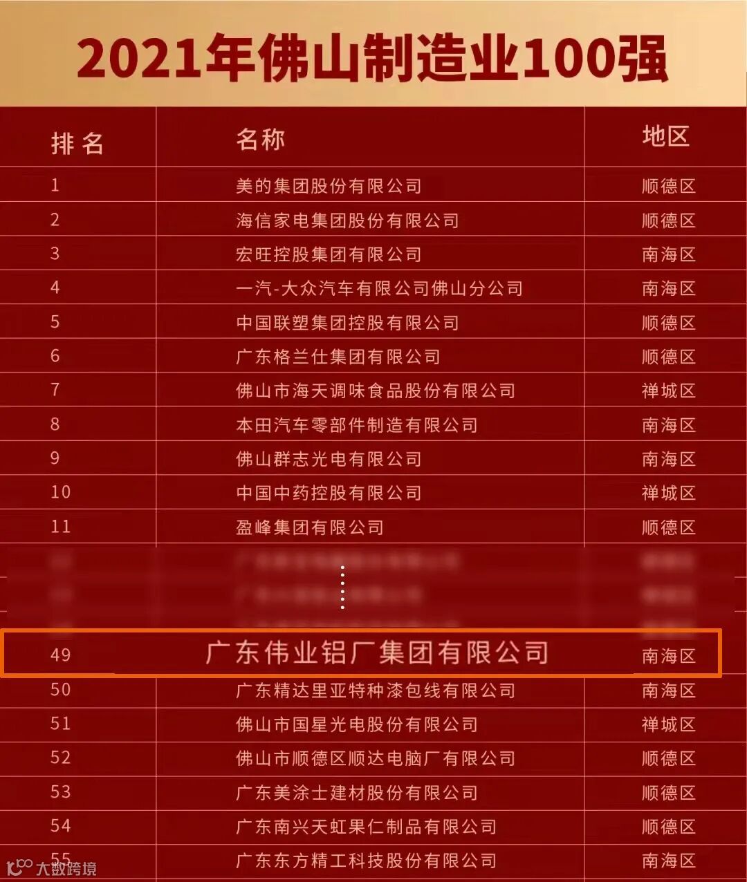 11月20日下午,由佛山市企业联合会、佛山市企业家协会主办,佛山市总商会联合主办的“2021佛山企业家活动日”,重磅发布2021年佛山企业100强、制造业100强。广东伟业集团入围“双百”榜单,位列佛山企业94位,佛山制造业49位。