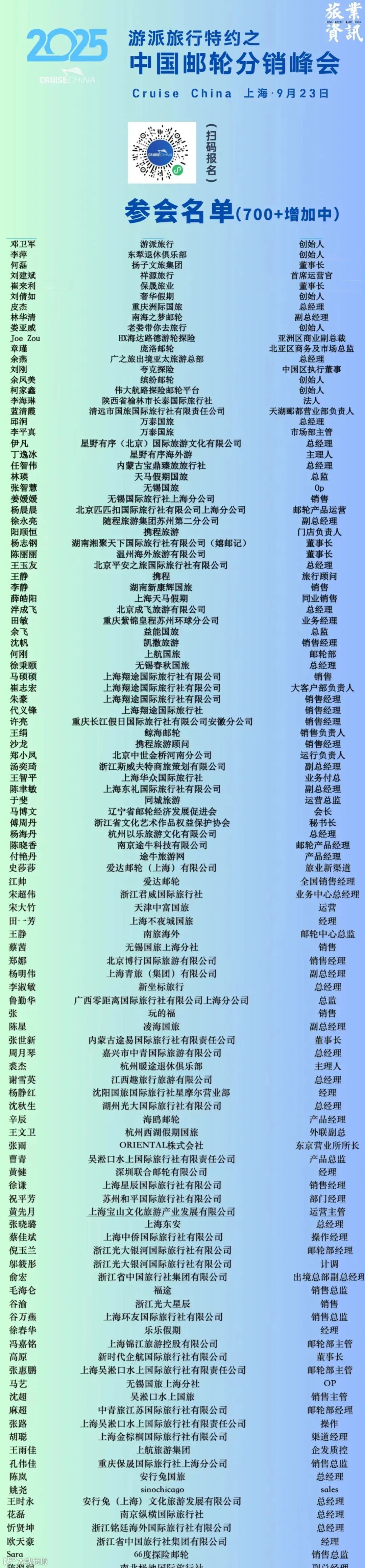 截至目前700+全球邮轮分销商已报名,为确保顺利签到进场,请所有与会嘉宾提前扫码注册!