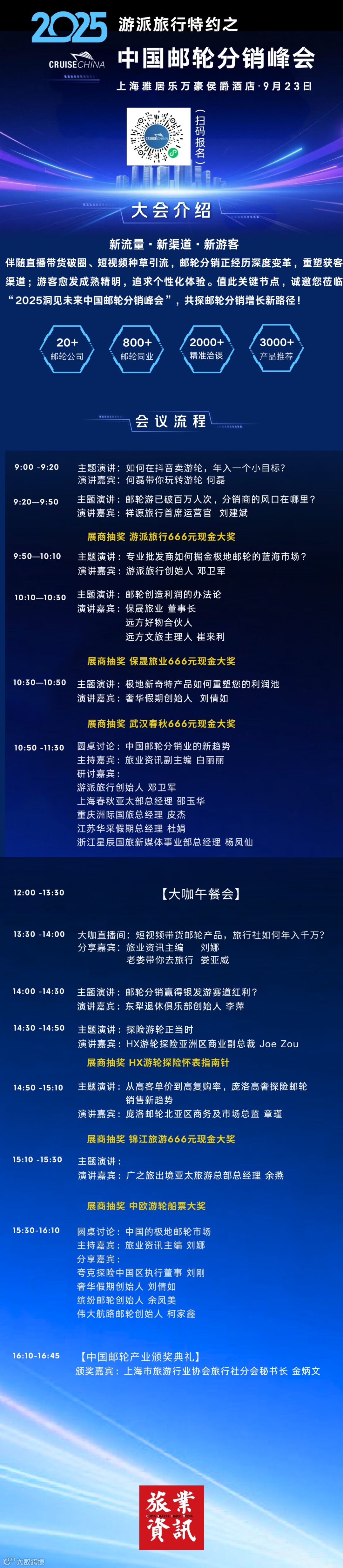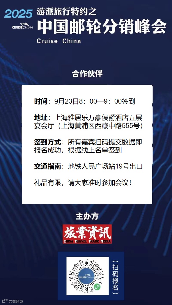 游派旅行特约之“2025中国邮轮分销峰会”将于9月23日在上海举办,20+邮轮公司,800+邮轮分销同业齐聚,一站式对接邮轮资源!