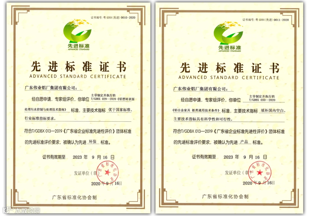 2020年9月15日,广东省标准化协会组织专家组对广东伟业铝厂集团有限公司(以下简称伟业集团)主导制定并执行的T/GDBX 029—2020《铝型材表面处理污水控制与处理技术指南》和T/GDBX 030—2020《铝合金家具 柜类通用技术条件》两项标准进行先进性评审。专家组确认T/GDBX 029—2020《铝型材表面处理污水控制与处理技术指南》标准“产品主要技术指标优于国家标准、行业标准要求”;T/GDBX 030—2020《铝合金家具 柜类通用技术条件》标准“产品主要技术指标无可比,属填补国内空白,主要技术指标具有科学性和可行性”。该两项标准被评价为广东省首批先进标准。