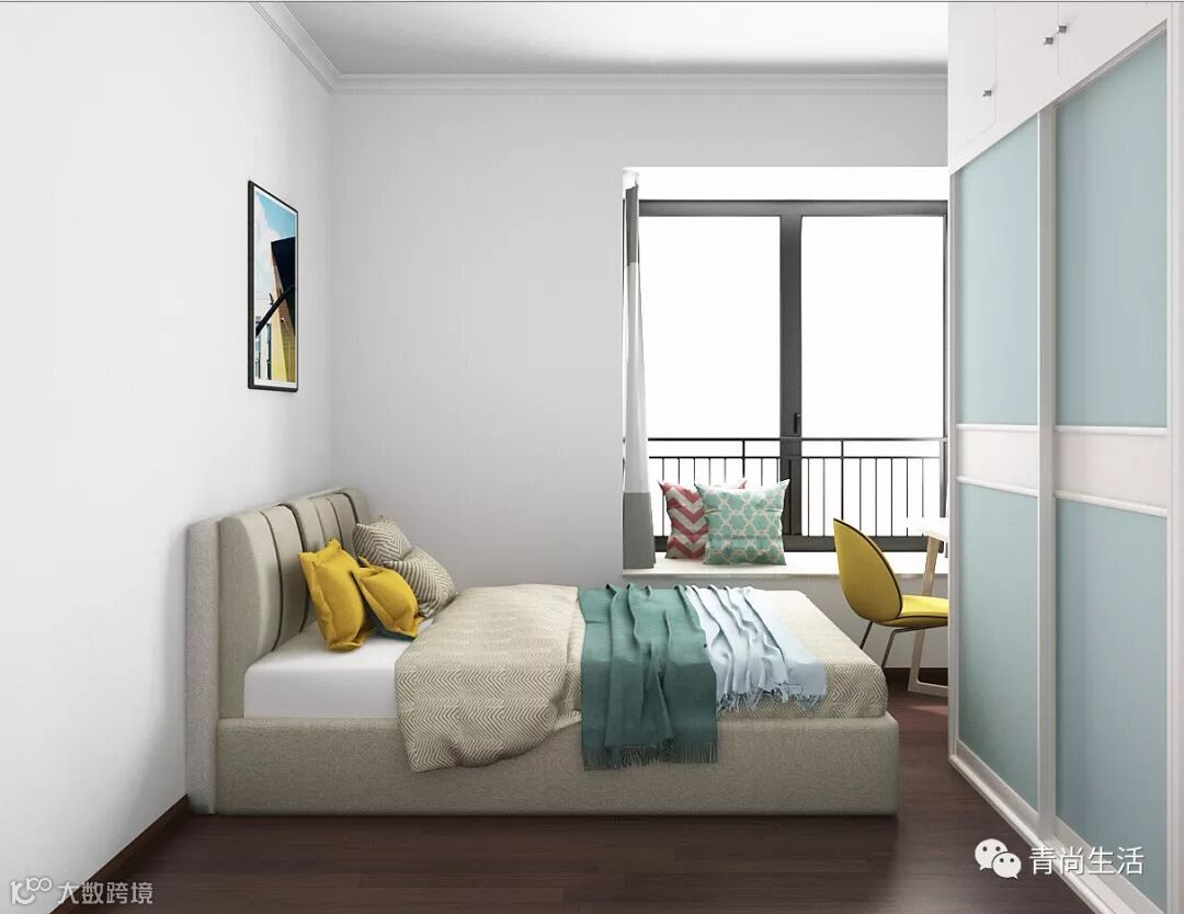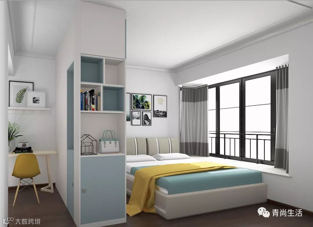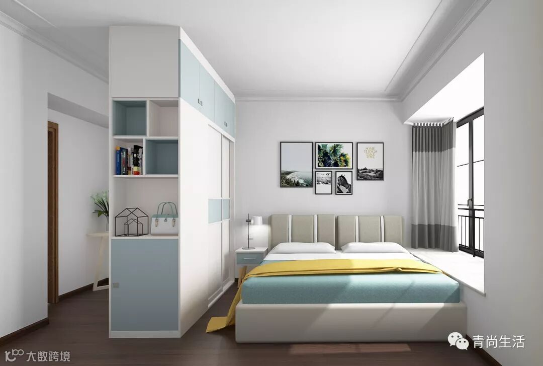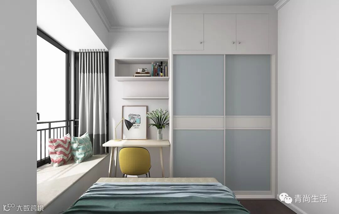 主卧的大衣柜集“收纳、展示、隔断”功能于一身。到顶设计,增加收纳空间。一边的侧面,设计成展示柜,可以放置书、包包或者其他装饰用品。整个衣柜将睡眠区隔开,一个人在书桌旁学习、工作时,也不会打扰伴侣休息。