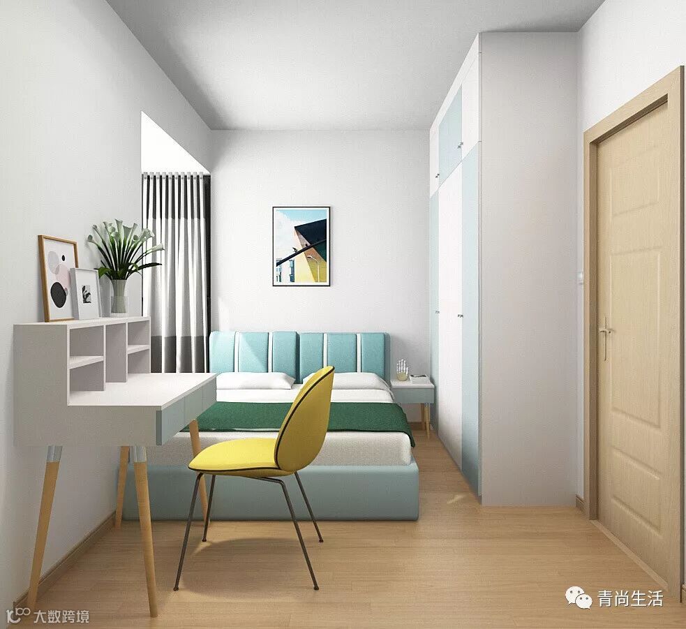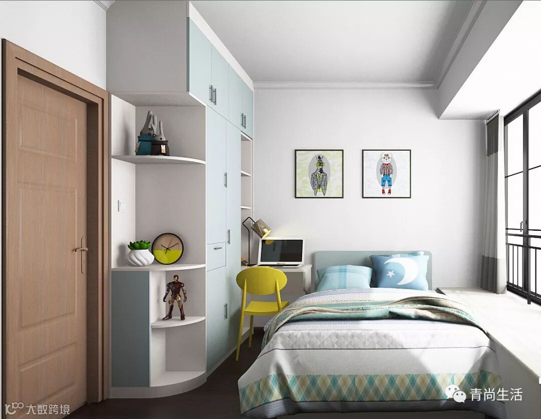 长辈房的家具造型不宜复杂,以简洁实用为主。在设计上,将家具尽量靠墙放置,以免造成室内通行的不便。同样选择淡蓝色,高雅宁静的色调,避免使用大面积的深颜色,给老人带来闷重的感觉。