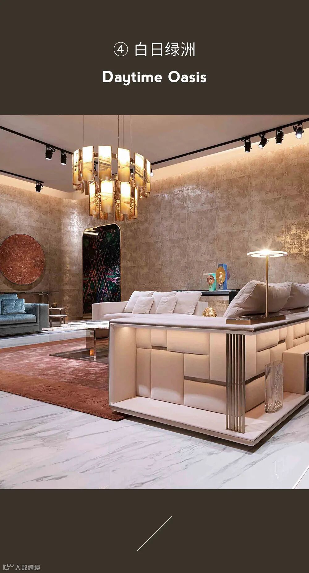 白日绿洲 Daytime Oasis 关注的是家庭生活的核心区域:客厅和餐厅。除了以全新面料和材质回归的 Babylon Rack 系列,Alessandro La Spada 还为 Mythica 设计了一套全新的起居空间组合,其特点是用模块化沙发合理布局。