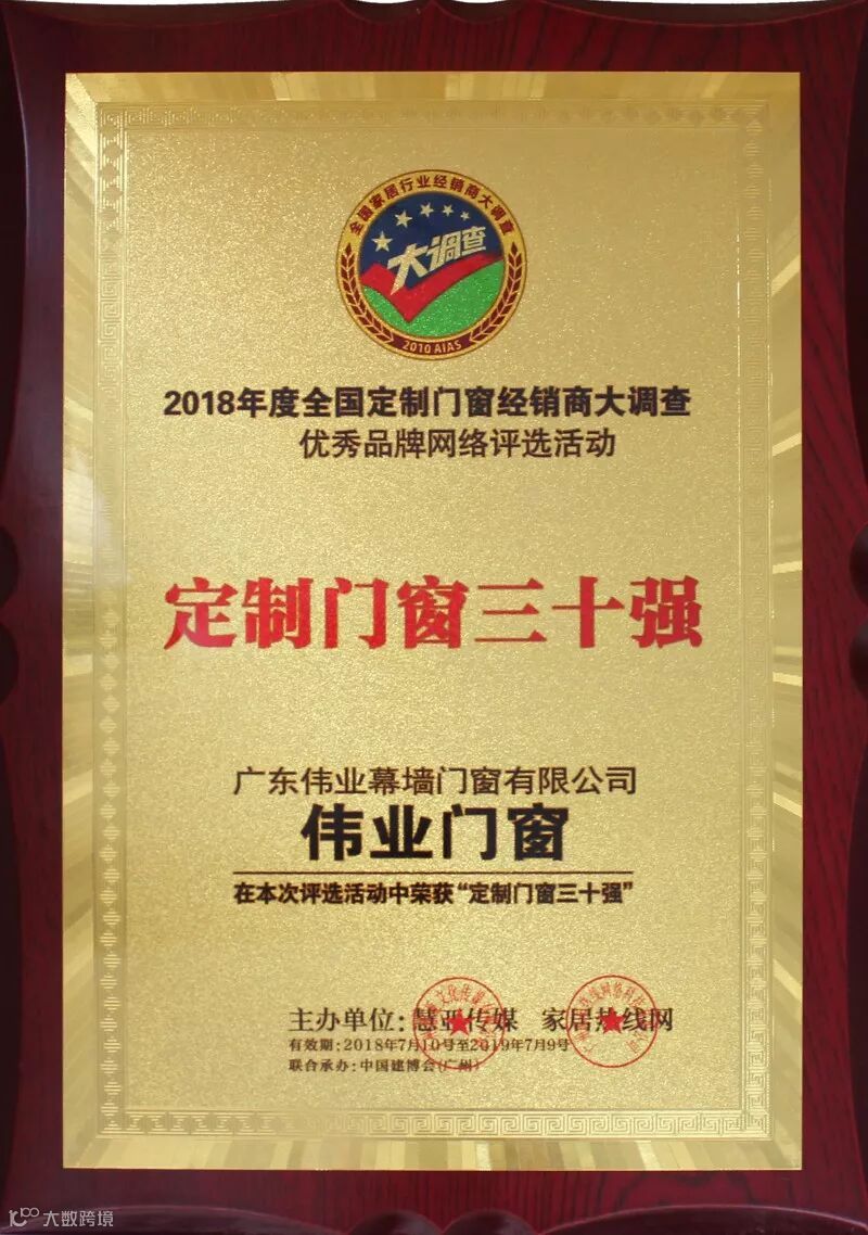 伟业门窗凭着先进的设计理念和高效精湛的研发精神,一举拿下“定制门窗三十强”的荣耀。能在此次门窗行业经销商调查中获得该荣誉,离不开广大群众的喜爱与支持。