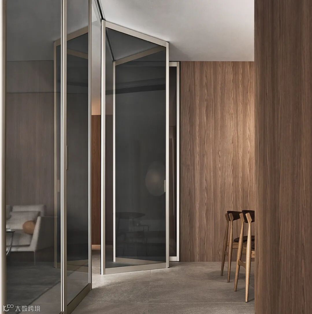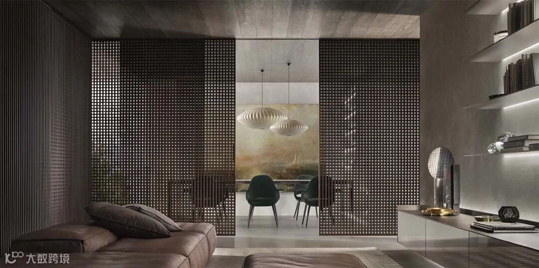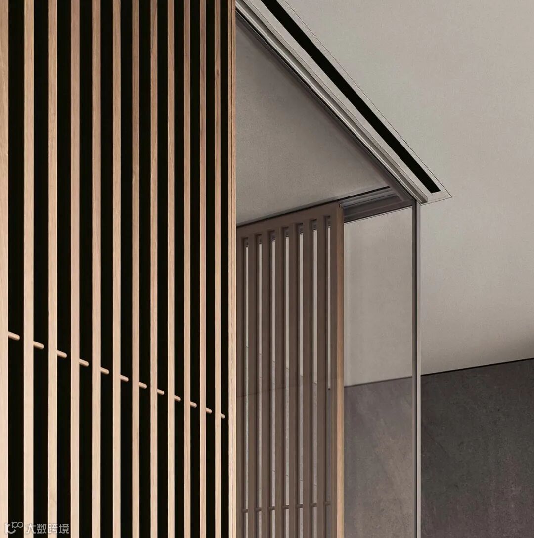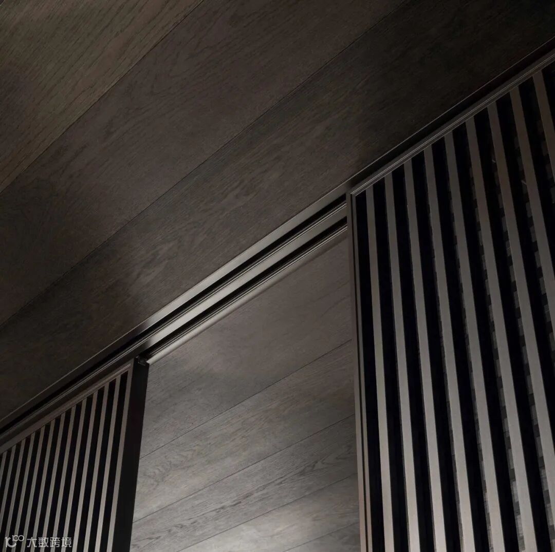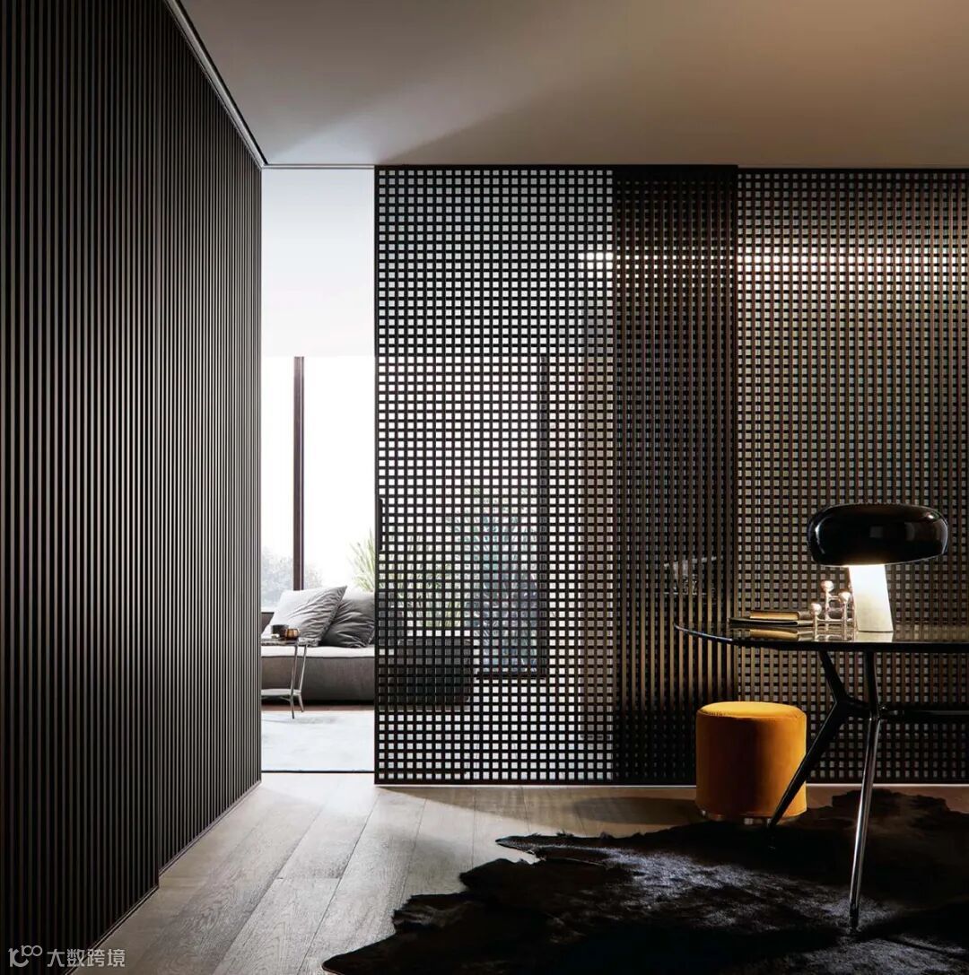 Daimon移门的设计灵感来自日式传统隔断的启发,双层玻璃面板搭配层压铝制格栅饰面,复古而迷人的美学,“隔而不断”的光影艺术,高级感十足。
