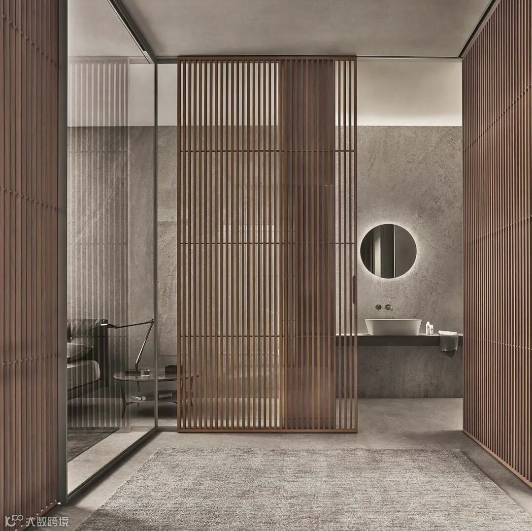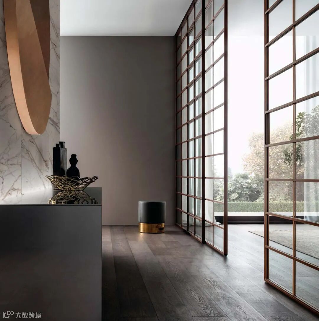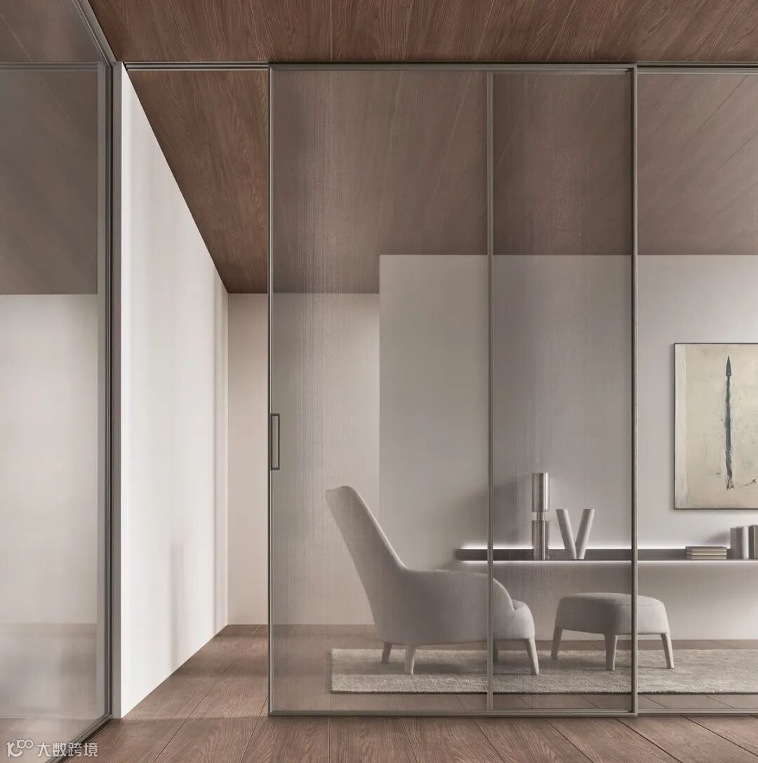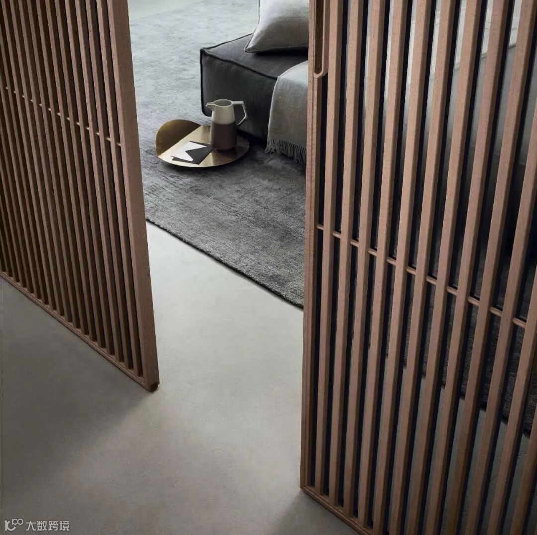 Daimon移门的设计灵感来自日式传统隔断的启发,双层玻璃面板搭配层压铝制格栅饰面,复古而迷人的美学,“隔而不断”的光影艺术,高级感十足。
