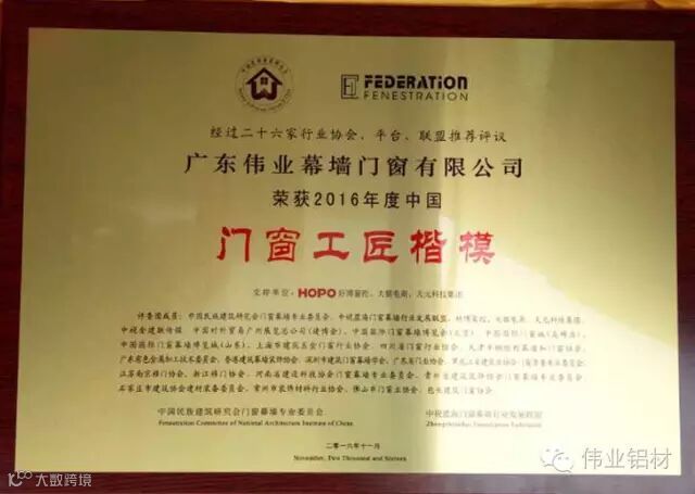 伟业门窗,积极响应国家号召,践行李克强总理提出的“工匠精神”,作为门窗行业“工匠精神”的先行者,以严谨、细致、负责的态度把握细节,用好铝材造好门窗的品牌理念,以高端的品牌定位及独特的设计理念发展研发和创新,以精益求精的态度对产品精雕细琢,在众多门窗品牌企业中脱颖而出,荣获 2016 年度中国“门窗工匠楷模”企业的殊荣!