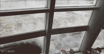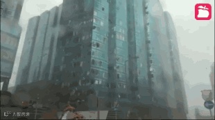 ▲香港红磡海滨广场的玻璃窗“横扫式”被吹爆