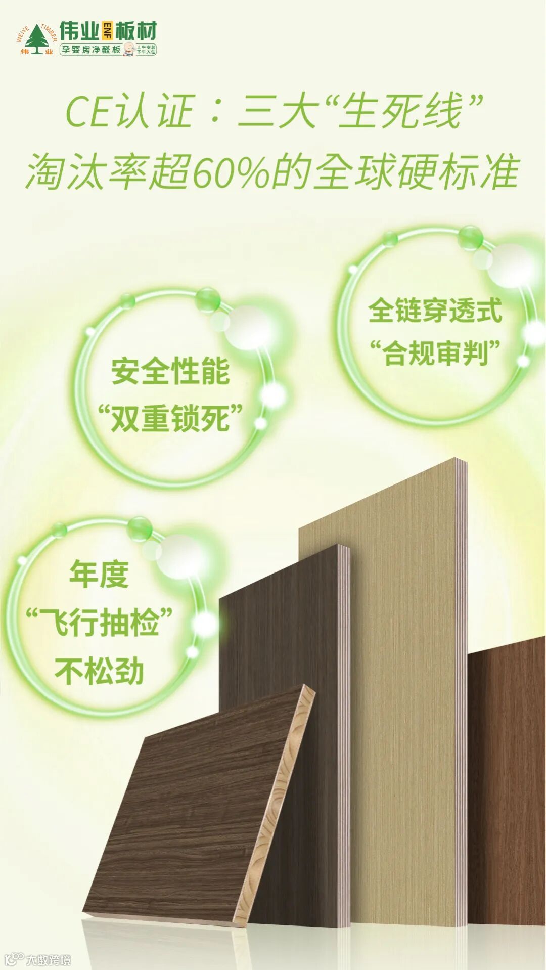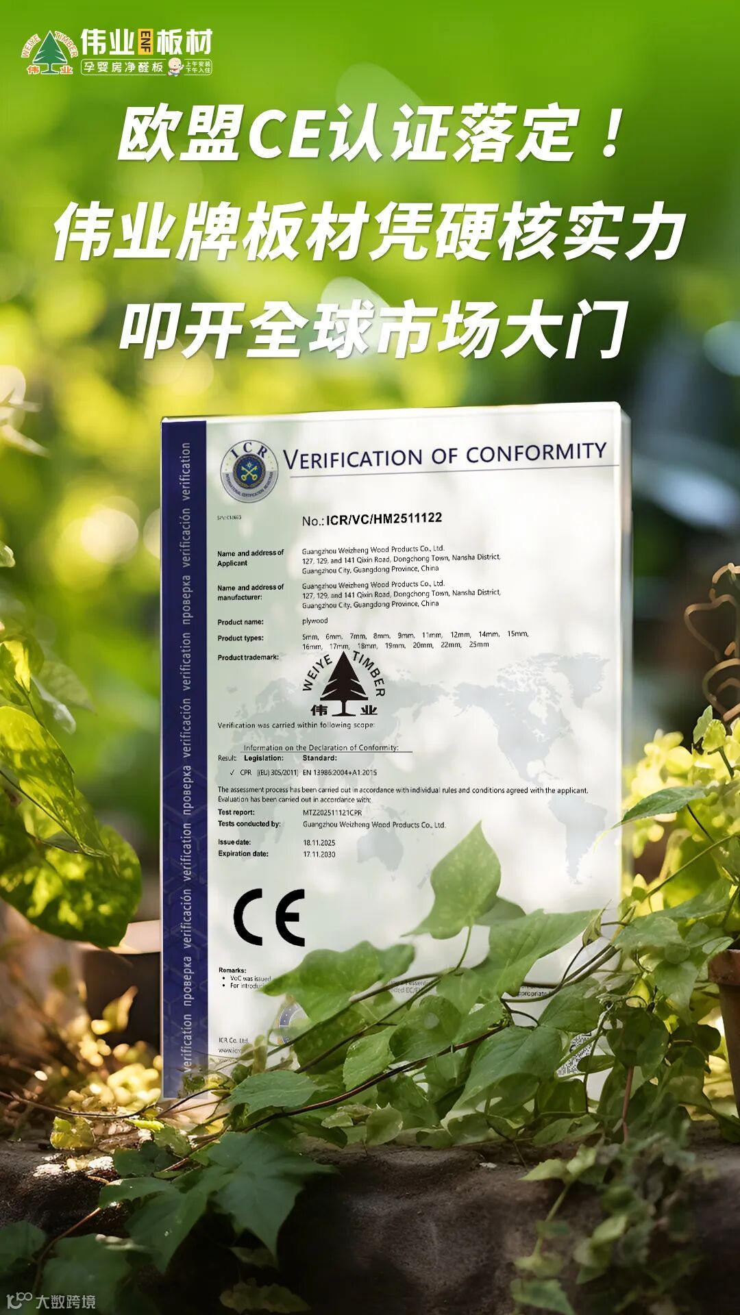 这次认证,是欧盟对中国板材30年成长的认可,更是伟业牌板材对全球消费者的承诺:选伟业牌板材,就是选“国际认证+ENF环保”的双重保障。未来,伟业牌板材将以CE标准为起点,持续攻坚绿色技术,让更多中国好板材,畅销全球。