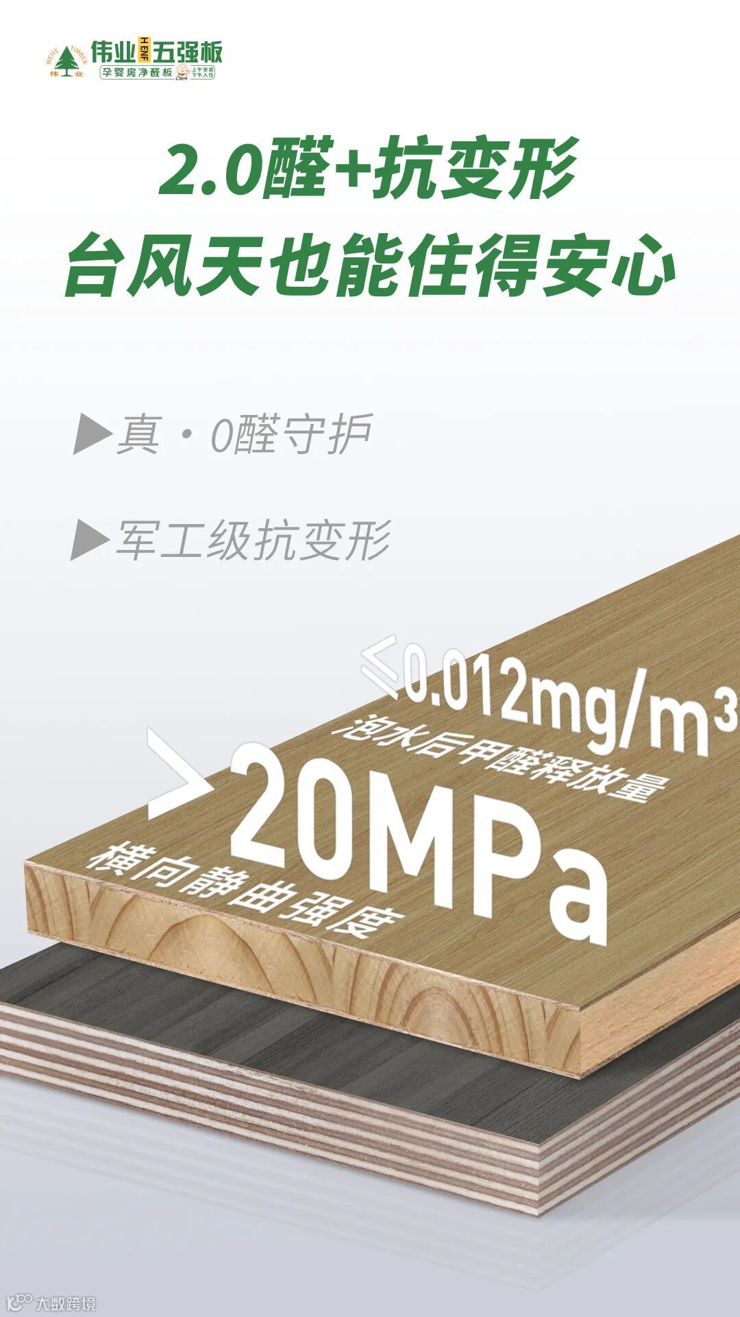 针对台风天短时泡水、梅雨季持续高湿,伟业五强板从根源解决“膨胀难题”: