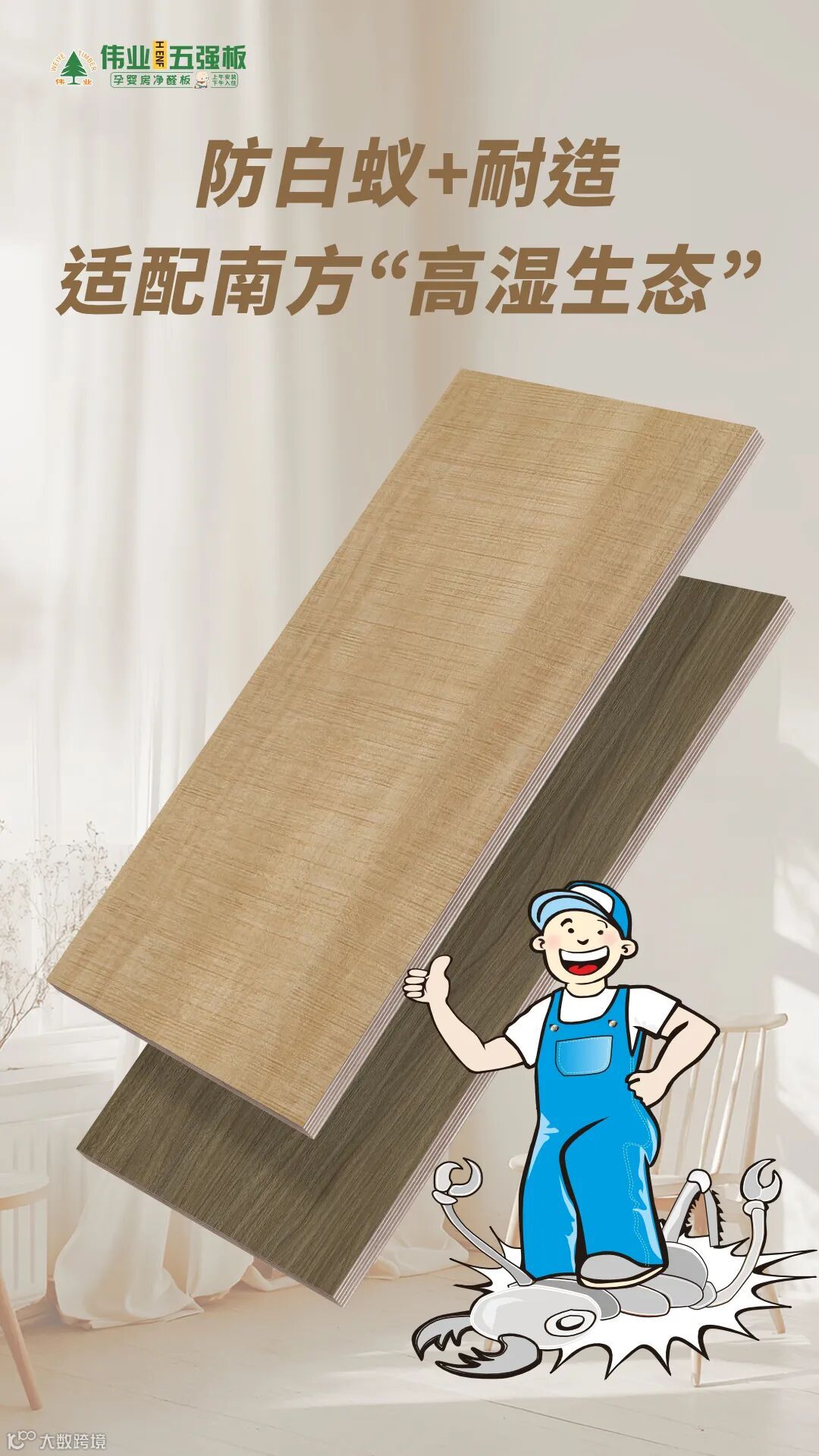 南方潮湿气候让白蚁成了“板材杀手”,伟业五强板自带“防御系统”: