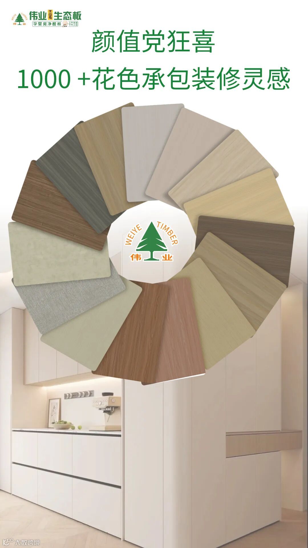 谁说环保板材只能单调?伟业HENF生态板自带 “颜值外挂”:从奶油风到新中式,1000+花色随心选;纳米级肤感工艺,触感如婴儿肌肤;3D浮雕纹理,完美复刻天然木材质感,让高端定制告别 “纯色板” 时代。