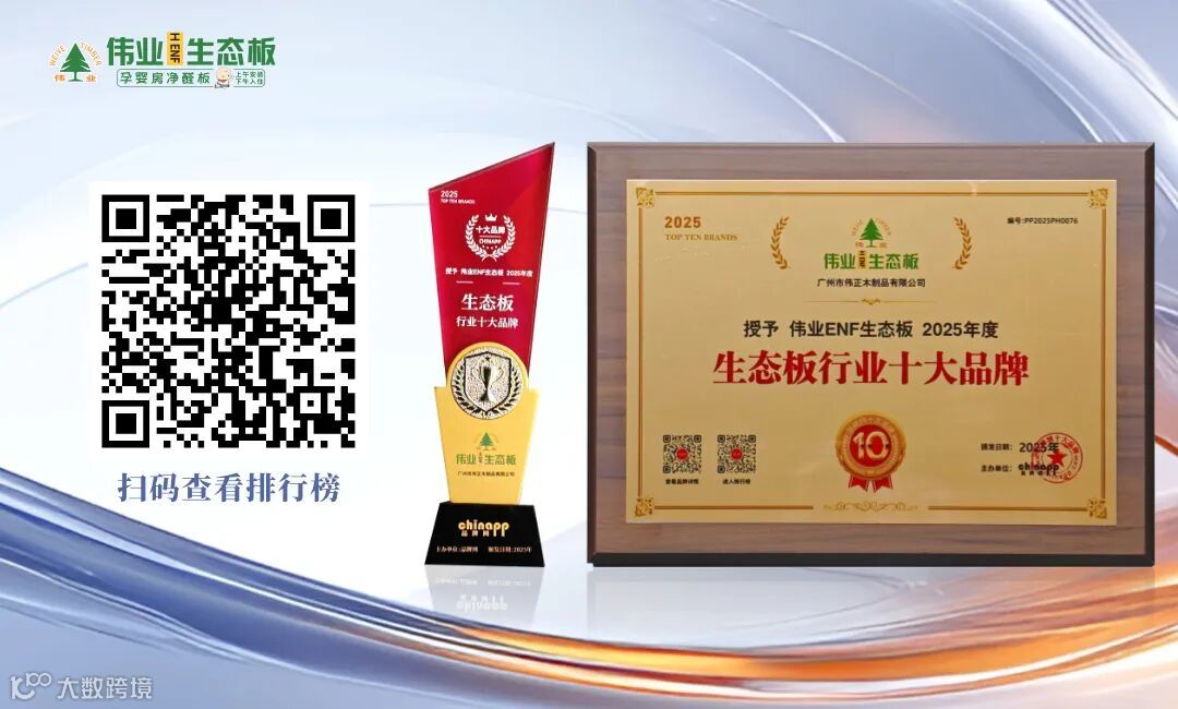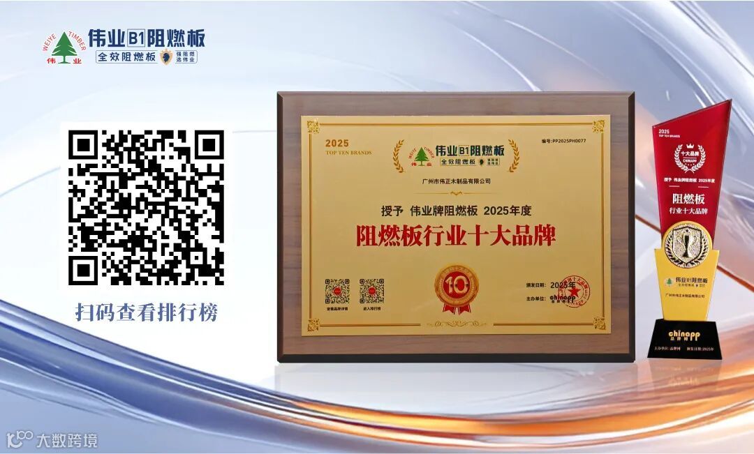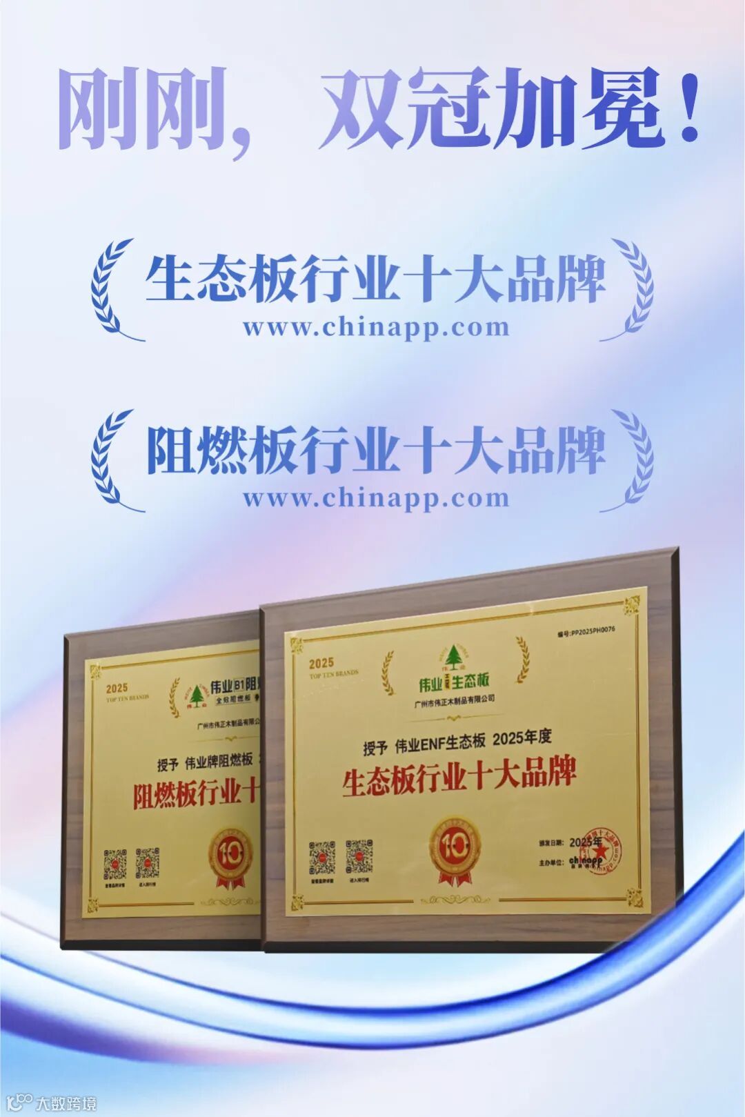 近日,伟业牌以 “双冠王” 之姿震撼登场!在品牌网权威发布的 2025 年度生态板十大品牌与阻燃板十大品牌榜单中,伟业牌凭借突破性环保技术与行业领先阻燃工艺,强势包揽双项殊荣!