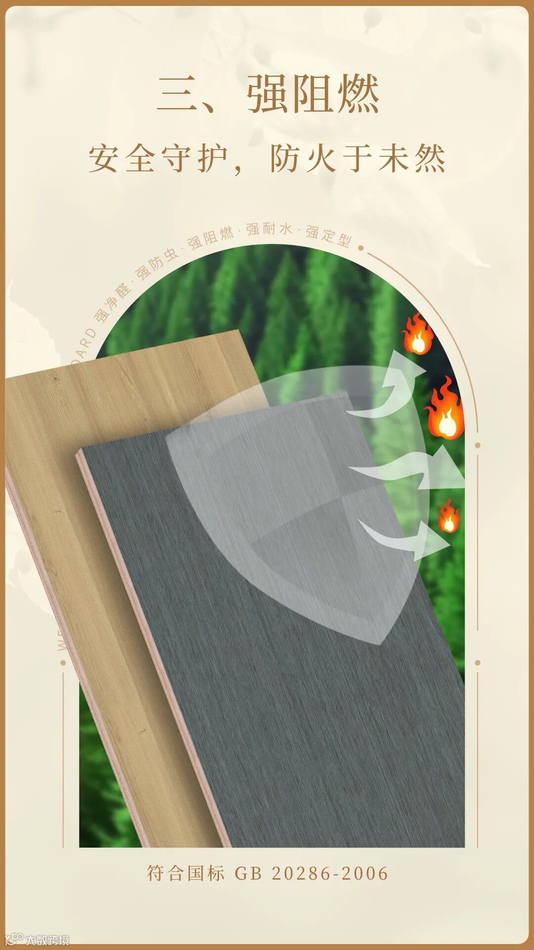 伟业五强功能板将安全理念融入每一个细节,阻燃剂360°全面覆盖,为板材穿上一层隐形的防护服,有效切断氧气供给,减缓木材热分解,抑制可燃气体产生。因此,该板材的燃烧性能达到B1级难燃材料的标准,为家居环境增添一份安心与保障。